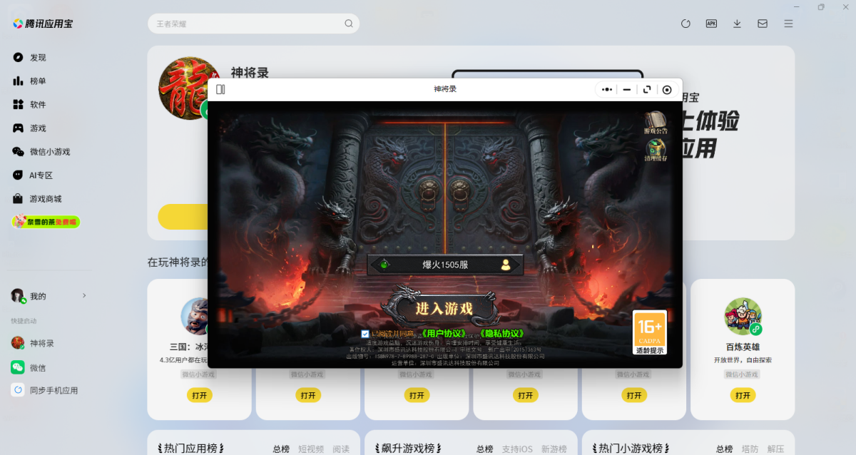 第二步:应用宝电脑版打开后会直接调起游戏,选择微信扫码或其他方式登录账号
