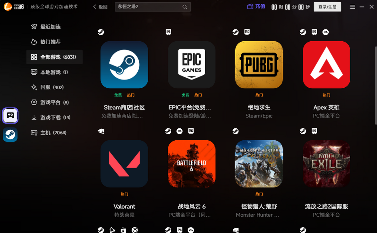 涵盖海内外超2000+款热门游戏 大众小众游戏应有尽有;雷神加速器支持市面上所有主流常见游戏加速,针对新上线联机加速游戏,第一时间提供游戏加速和免费体验,海量游戏全覆盖;