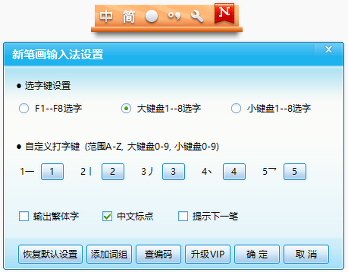 打字键:默认情况下,台式机小键盘1--5打字,笔记本如果没有小键盘,用户可自行设置为大键盘1--5打字,也可根据自身习惯自定义打字键。