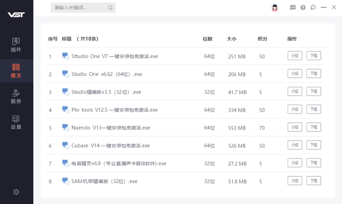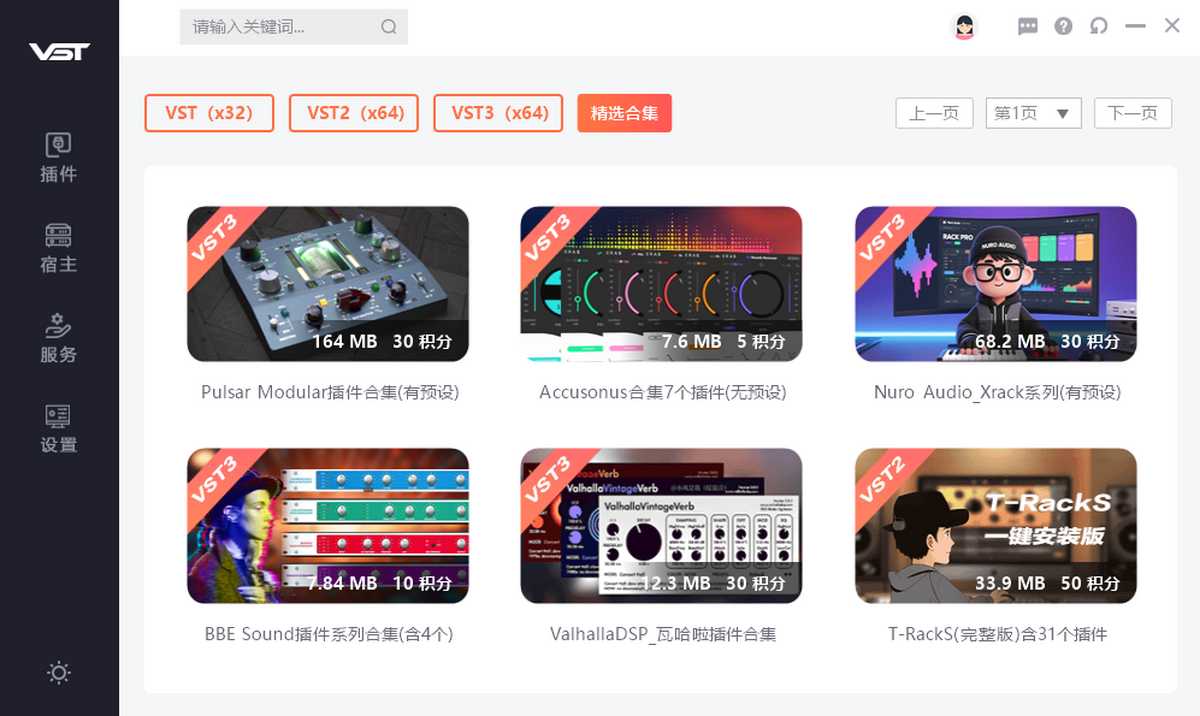 1.内置海量 32 位与 64 位 VST、VST3 插件供下载,涵盖 Waves 合集、Antares 插件合集、iZotope 合集、Softube 合集、ValhallaDSP 合集等专业 VST 公司出品的各类音频处理插件。