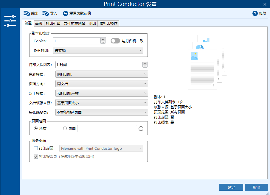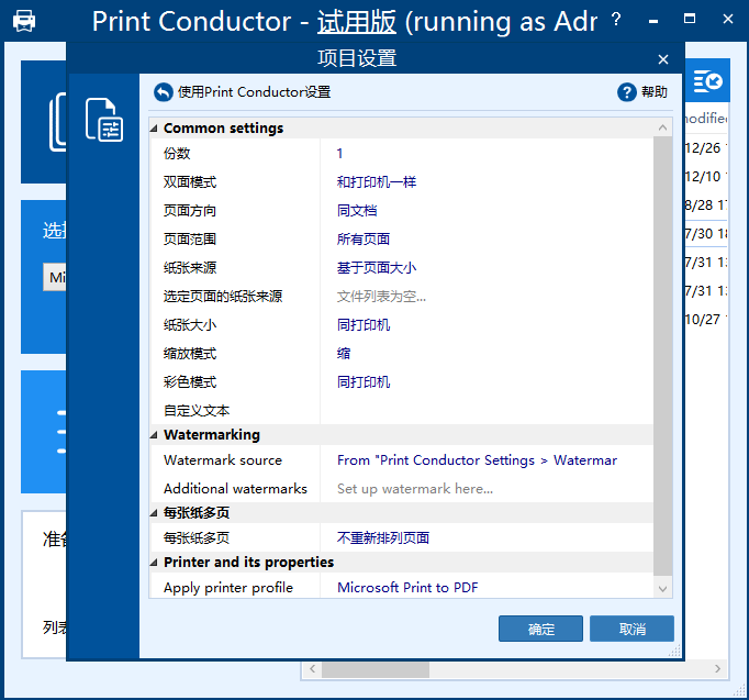 使用Print Conductor更改打印机设置或者是使用各种功能。你可以选择一台打印机,选择纸张大小、打印份数,输入文档密码。指定打印附件、排序类型、图像分辨率(DPI)、颜色或灰度打印(颜色模式)。设置打印为图像、PDF套印、打印公司标志、页码等等。