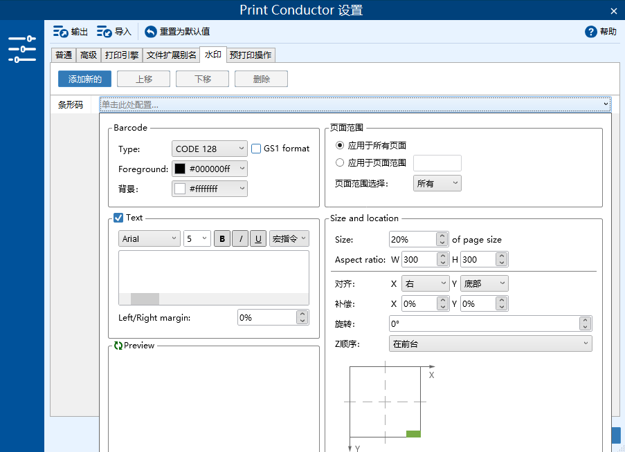 Print Conductor允许你在列印的页面上插入一个浮水印。有三种类型的浮水印可供选择。