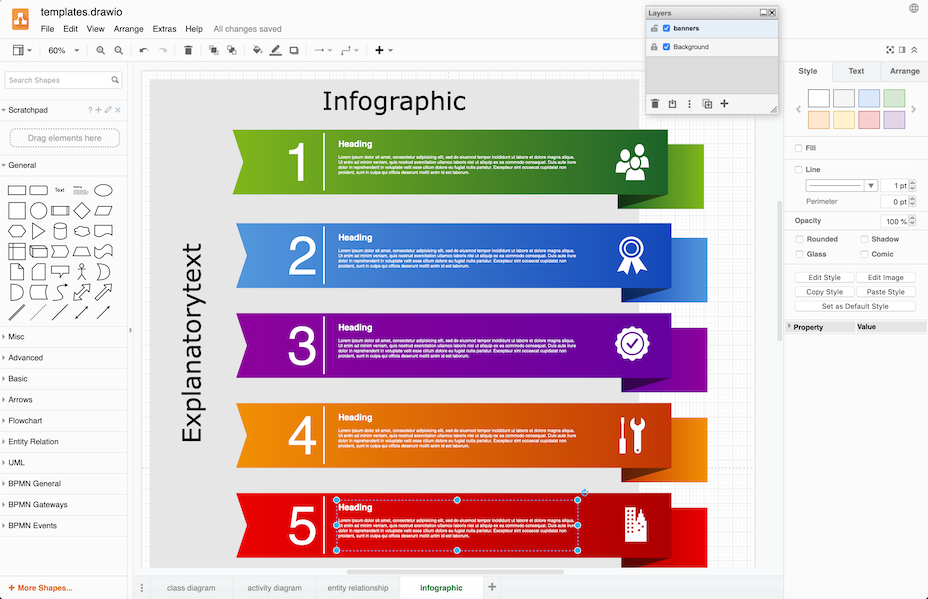 创建流程图,流程图,组织结构图,UML,ER图,网络图等。使用自动布局功能的强大功能,创建自己的自定义形状库或使用我们提供的大量形状库,其中包含数百种视觉元素。使用元数据将更多有用的信息打包到图中。
