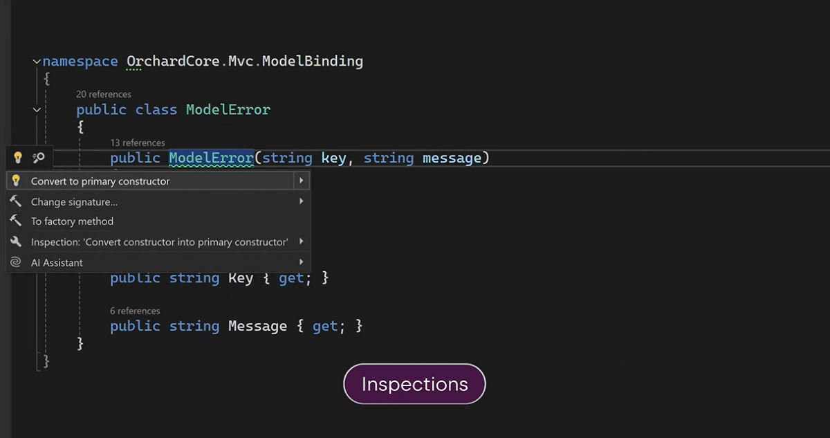 最后但同样重要的是,新增的检查、快速修复和上下文操作可以帮助您在经典扩展方法与新语法之间顺畅切换。