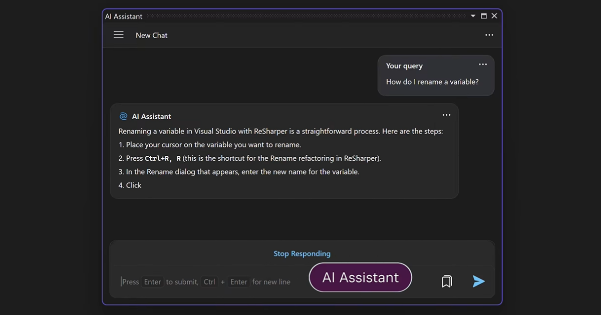 利用我们的智能 AI Assistant 释放 AI 的全部潜能。通过利用可感知上下文的 AI 聊天,您可以在文本编辑器中直接提出任何基于编程的查询,或者请求 AI 解释代码或查找特定代码段中的问题。无需将代码手动复制到聊天中。此外,您还能够为未实现的方法生成代码、生成 C# 文档注释或在输入时接收多行代码建议。一切都变得如此简单 – 简化您的编码体验,交给 AI Assistant 就够了!