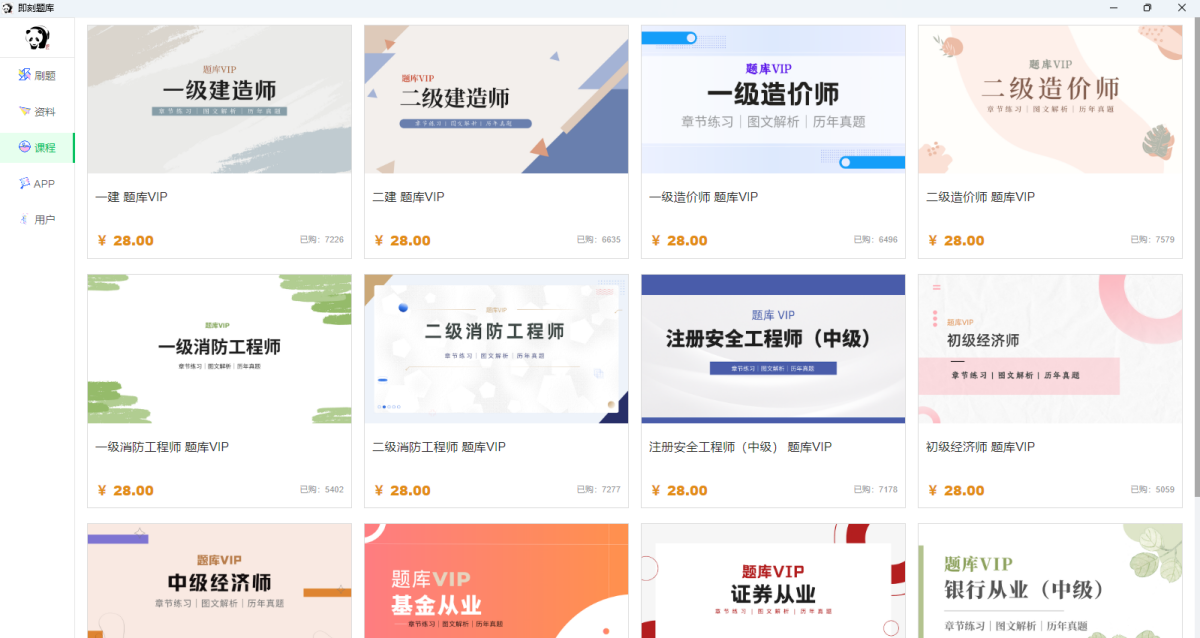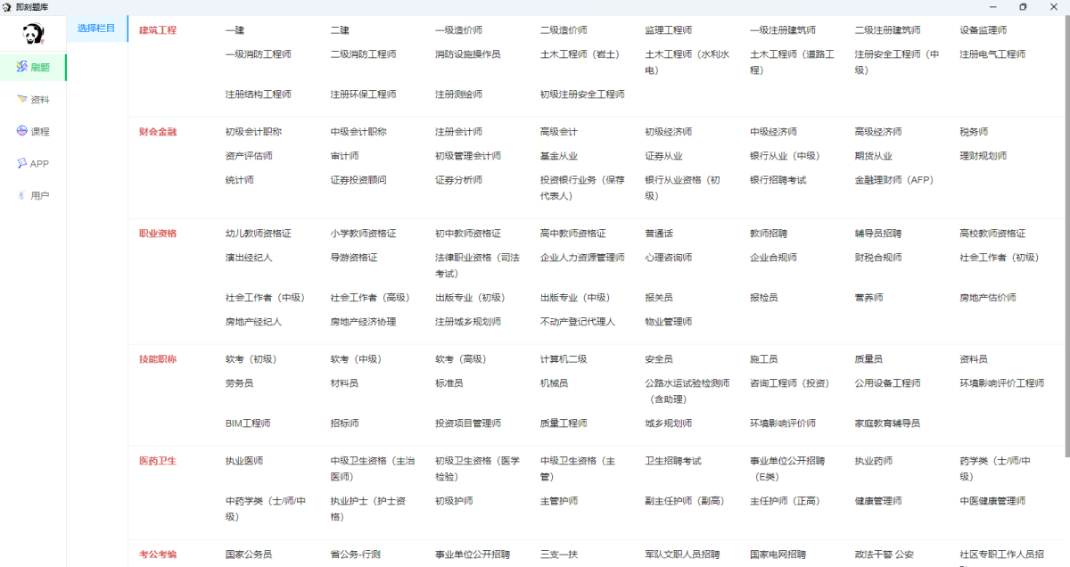 主要包含:建筑工程、财会金融、职业资格、技能职称、医药卫生、考公考编、学历提升;如:一建、二建、教师资格证、注册安全工程师、经济师、演出经纪人、导游证、职业(护士,药师)、银行从业、社会工作者 等近千个热门科目。