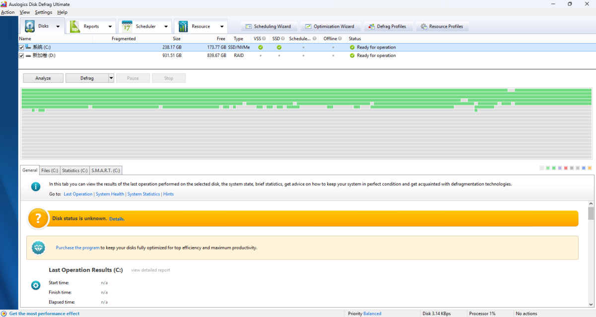 磁盘碎片整理终极版检测你的系统驱动器是否为SSD并应用特殊的SSD优化算法,而非碎片整理。这大大减少了写入作的次数,防止了过度磨损,并有助于延长磁盘的使用寿命。如果你不想把SSD纳入碎片整理或优化,可以设置SSD完全不显示在硬盘列表中。