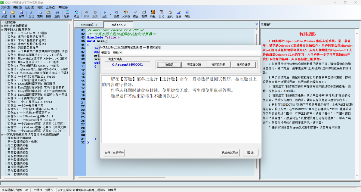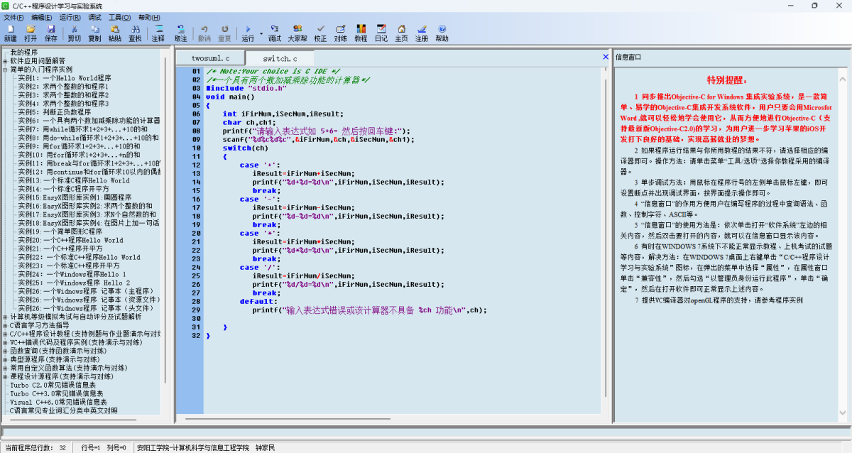 C/C++程序设计学习与实验系统是根据【程序设计不是学会的,而是练会的】理念针对C语言初学者的特点开发的C语言学习系统,继承了原软件简单易用特点,支持32位与64位的操作系统WINDOWS 7/8/10/11,针对C语言初学者的特点设计了【编程入门训练-强化编程训练-综合编程训练】的强化编程训练流程,如下图所示,用简单的入门程序实例、错误代码及实例,C语言教程训练引导用户进入C语言,用120余道编程题供强化用户编程训练(编程思路、对照练习、程序自动评测、编程笔记),同时采用“自顶向下、逐步细化”的方法,设计两个由简到难(简单的计算器、通讯录管理系统)的综合程序训练用户的综合程序的设计能力。软件集成了豆包、腾讯元宝、通义千问、DeepSeek等AI辅助编程工具,解决用户看不懂程序错误信息、面对题目不知道如何编程、找到有用到源代码却看不懂代码、方便对照练习等问题。