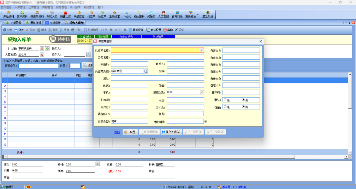 入库管理:进行货品采购入库,采购退货,进货单据和退货单据查询,供应商往来帐务,供应商付款。