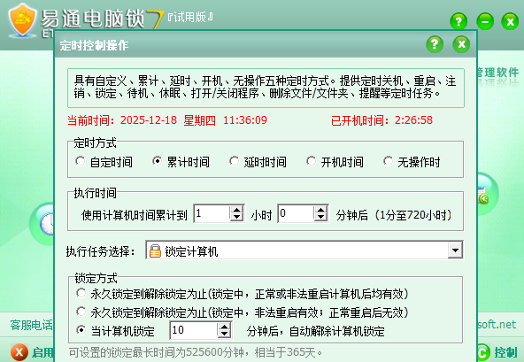 易通电脑锁可随意设置每天电脑使用时间和上网时间段。时间段状态提供了正常使用状态、禁止上网状态、电脑锁定状态、电脑关机状态供用户选择。累计使用时间控制提供了每天累计使用电脑总时间和上网总时间表,可随意设置每天使用电脑的总时间或上网总时间。控制状态提供了禁止上网状态、电脑锁定状态、电脑关机状态供用户选择。