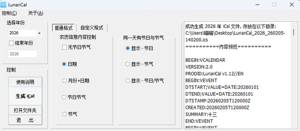 9、【打开所文件夹】能够直接打开LunariCal程序文件所在的文件夹,方便定位生成的ical文件。