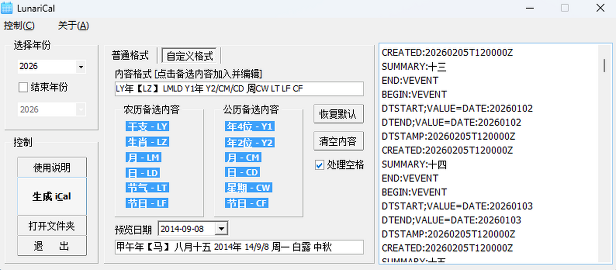 6、【自定义格式】用于生成不同格式的农历信息内容,在内容格式框进行格式编辑,特定的信息内容可通过备选内容框选择,编辑同时底部预览框会有即时效果预览,选择预览日期可以查看不同日期下的格式效果。勾选【处理空格】后会把输出内容中的多余空格合并为一个空格。