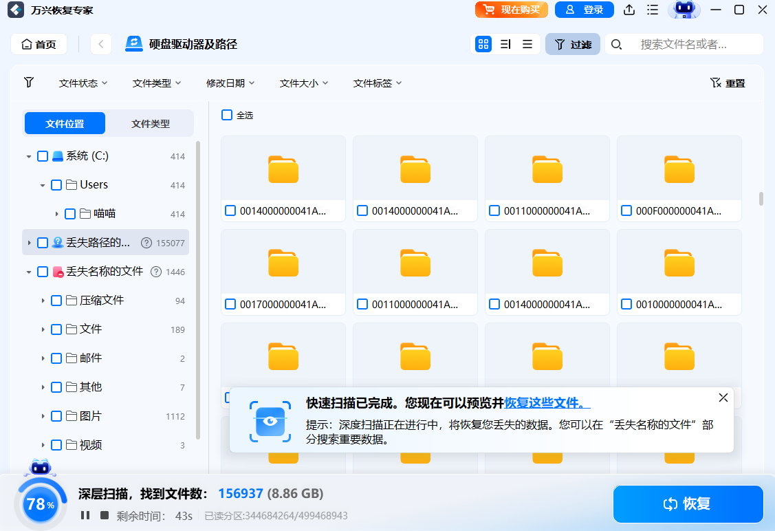 深度扫描模式只适用于回收站数据恢复未找回的场景,而且也需要更多时间扫描,请用户耐心等待,或最小化后台运行,待完成后将会有提示音。如找到目标文件,即可进行预览并恢复到本地电脑。