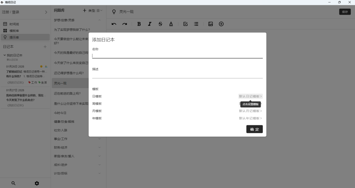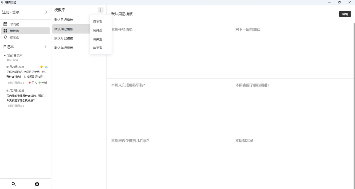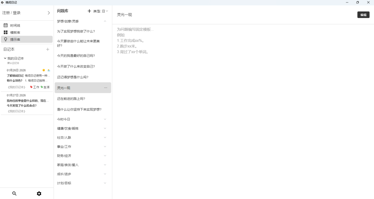 格间日记支持格子模板编辑,并提供丰富的问题引导库,在主页右上角更多、模板库和提示库中可以找到这个功能。 你可以随意定制符合您习惯的格子模板,并使用模板创建更有意义的日记。