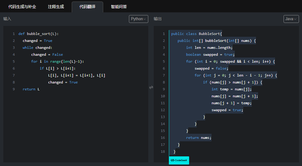 基于AI大模型对代码进行语义级翻译,支持多种编程语言互译。