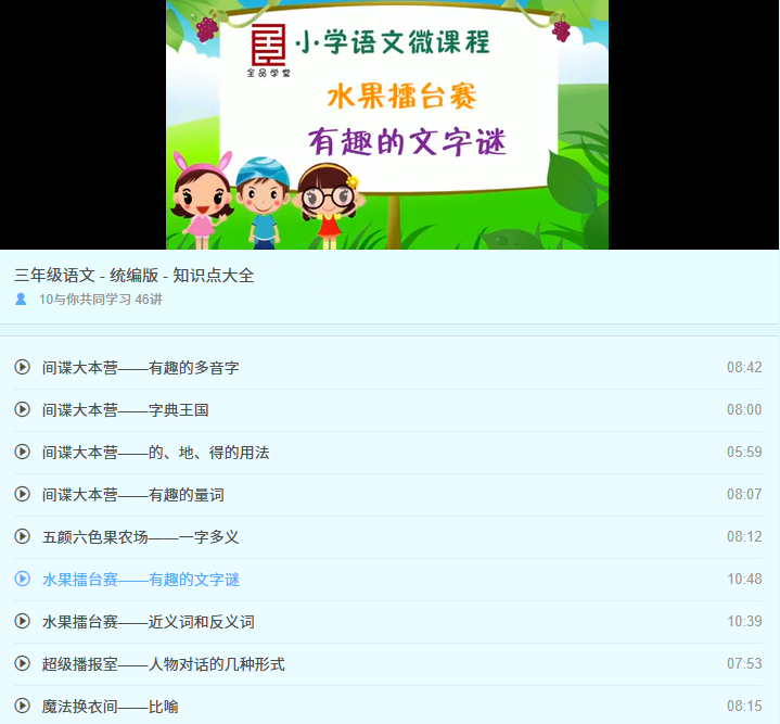 软件涵盖的知识点包括:间谍大本营——有趣的多音字,间谍大本营——字典王国,间谍大本营——的、地、得的用法,间谍大本营——有趣的量词,五颜六色果农场——一字多义,水果擂台赛——有趣的文字谜,水果擂台赛——近义词和反义词,超级播报室——人物对话的几种形式,魔法换衣间——比喻,魔法换衣间——拟人,魔法换衣间——排比,魔法换衣间——夸张,神奇弹力球——给句子“增肥”,神奇弹力球——给句子“瘦身”,五颜六色果农场——标点符号对对碰,小翰林学宫——有趣的对联,水果精灵探秘室——理解词义的方法,水果精灵探秘室——把握文章中心句,奇幻温泉俱乐部——记叙文六要素,水果精灵探秘室——记叙文的结构,水果精灵探秘室——自然段的构段形式,水果精灵探秘室——概括文章的段意,水果精灵探秘室——概括文章主要内容,水果精灵探秘室——概括文章的中心思想,涂鸦美术馆——单图作文训练,涂鸦美术馆——多图作文训练,七彩化妆间——外貌描写,动感健身房——动作描写,魔力预言屋——语言描写,神奇的魔镜——心理描写,神奇的魔镜——神态描写,成长相册——观察日记,水滴实验室——感想日记,百变童话书——想象日记,神秘飞毯——大胆合理的想象,神秘飞毯——想象作文的类型,森林王国——小兔子的留言条,森林王国——小猴子的请假条。