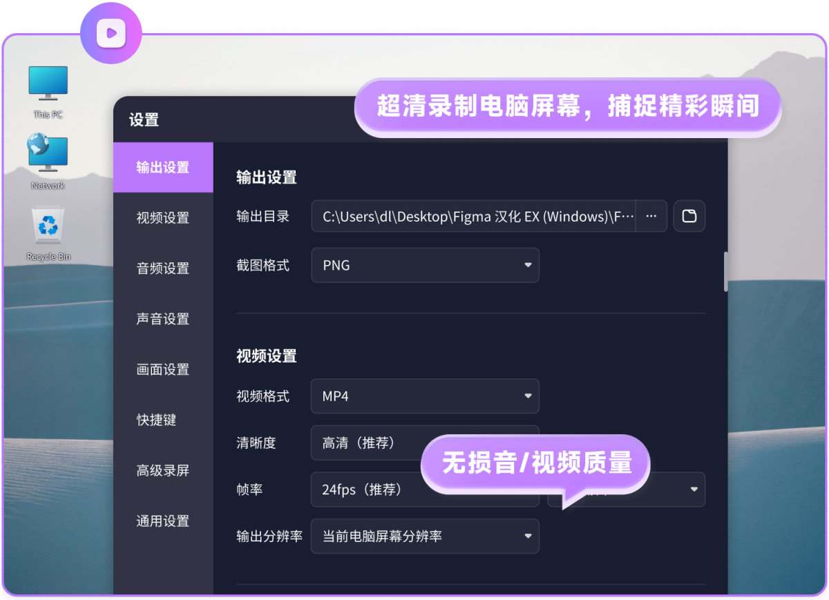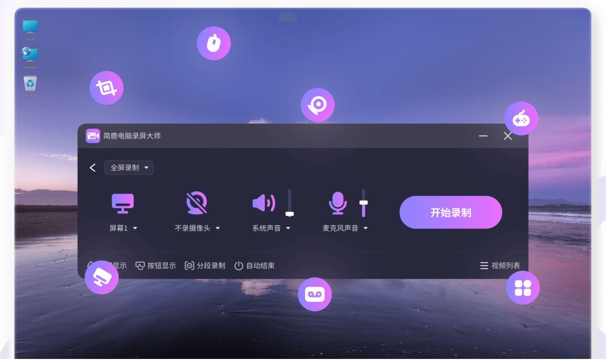 2.全屏录制:录制完整屏幕,同时可开启摄像头进行画中画录制,适合录制课程。