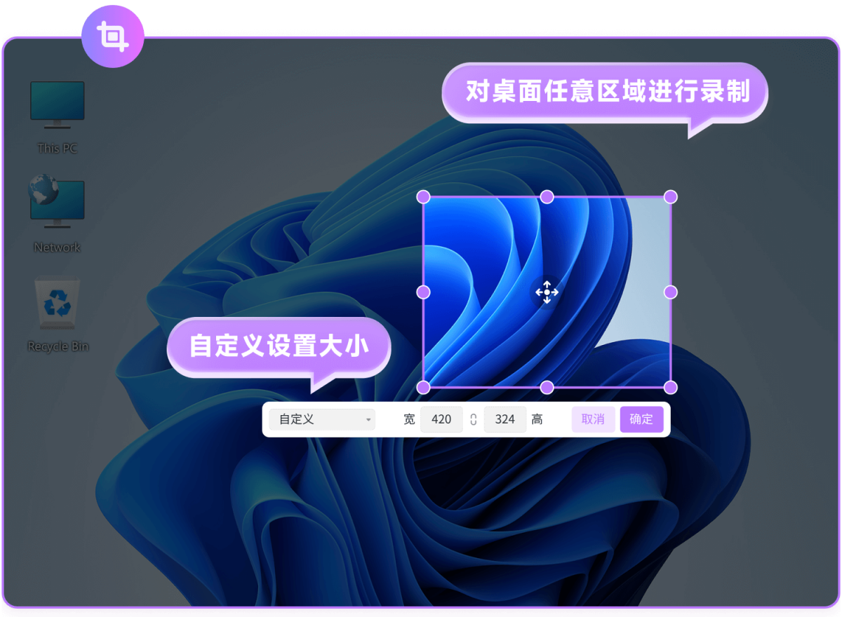 3.区域录制:可自定义框选录屏区域,想录哪里就录哪里,适合直播录制、会议录制等应用场景。