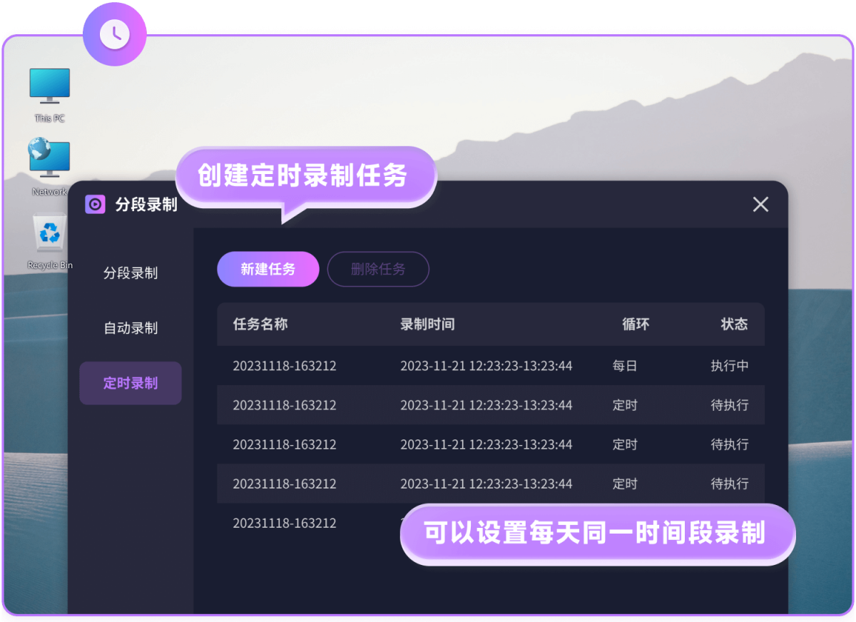 8.定时录制:可以提前设置录制模式、循环方式、开始时间、录制时长等,电脑在到达指定时间时会自动开始录制,适合不能一直待在电脑前,但需要开始录屏的情况下使用。