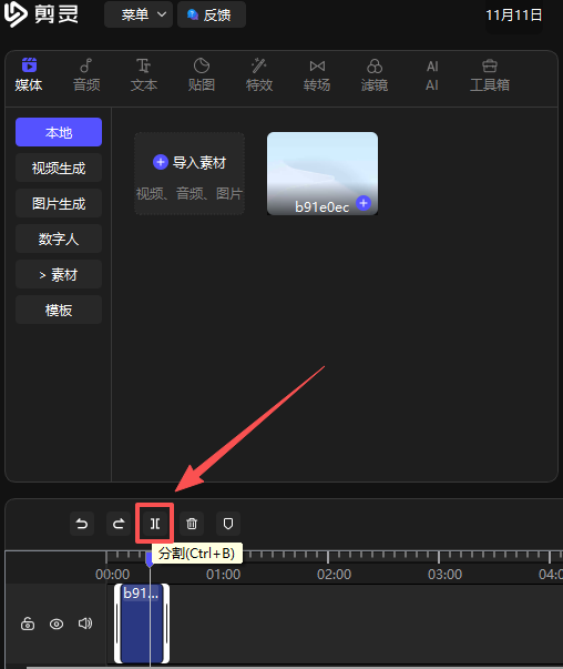 如果需要将视频分割成几个片段,选中轨道内的文件,移动播放指针到需要要裁切的地方,点击工具栏里的“切割”按钮。