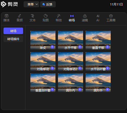 答:选择【转场】板块,打开转场素材区,选中喜欢的转场样式,用鼠标直接拖到两个视频片段之间即可。