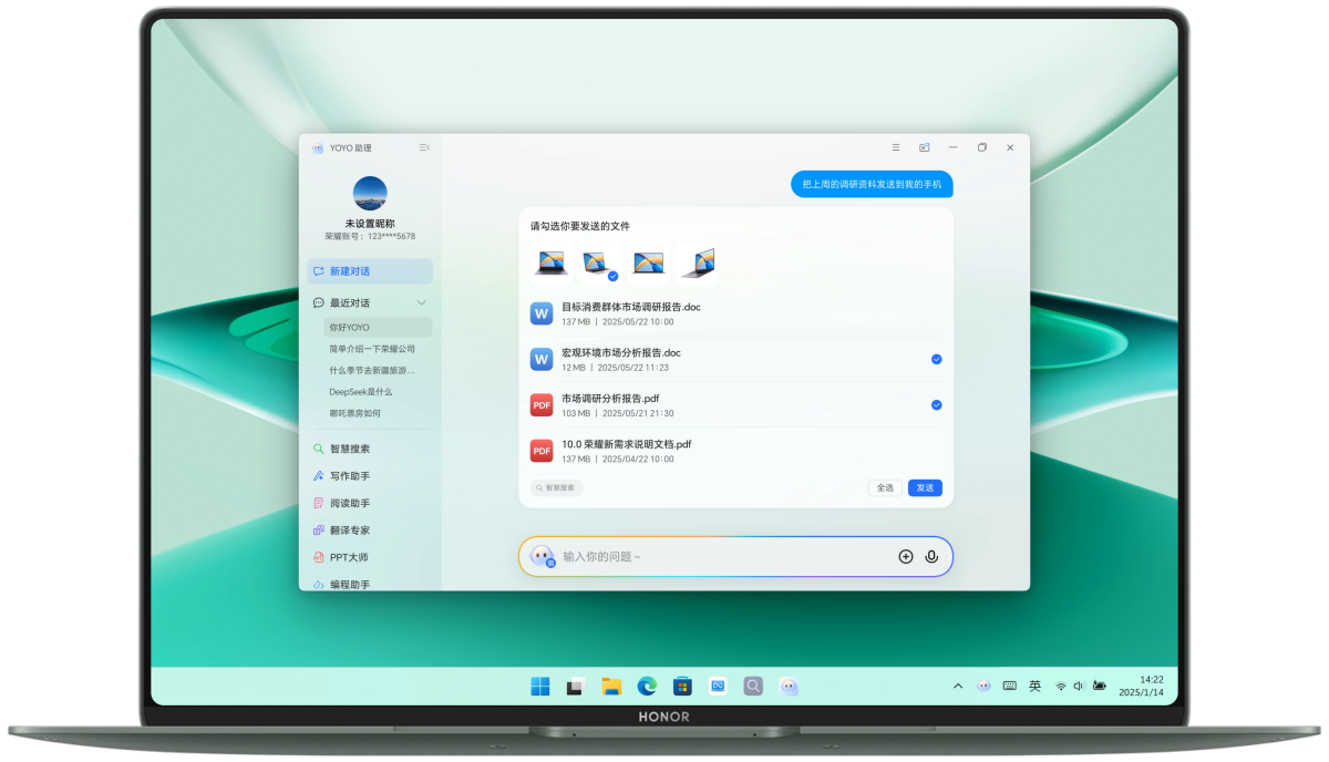 支持Windows系统智控、自研应用智控、跨设备智控(发送文件到其他设备等)以及跨应用智控。