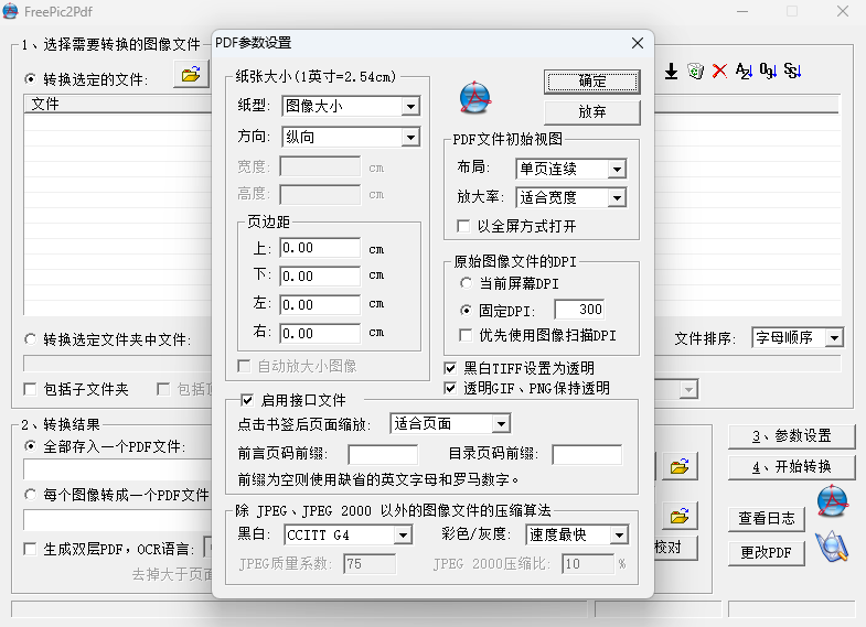 5.可以指定生成的PDF文件的页面大小(除A4、B5等,还支持国内常用的32开、16开、大32开)及页边距,这种指定不会造成对图像数据流的重新采样或压缩,只影响PDF中描述图像显示大小的数据, 避免因为重新采样或压缩而造成图像质量下降。