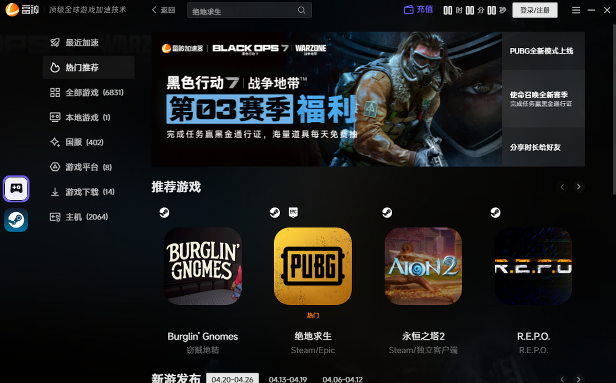 涵盖海内外超2000+款热门游戏 大众小众游戏应有尽有;雷神加速器支持市面上所有主流常见游戏加速,针对新上线联机加速游戏,第一时间提供游戏加速和免费体验,海量游戏全覆盖;