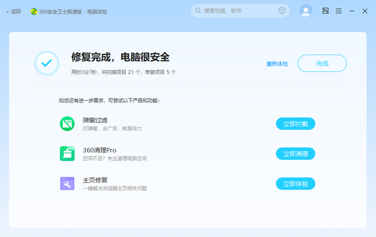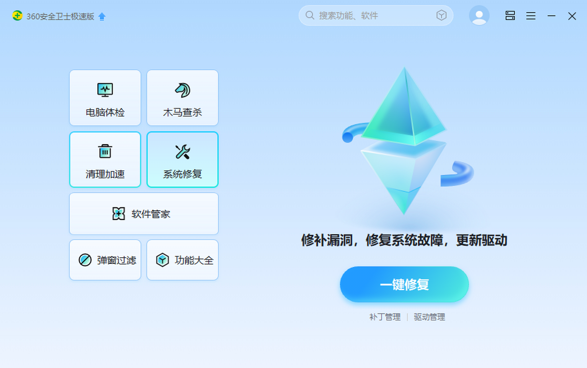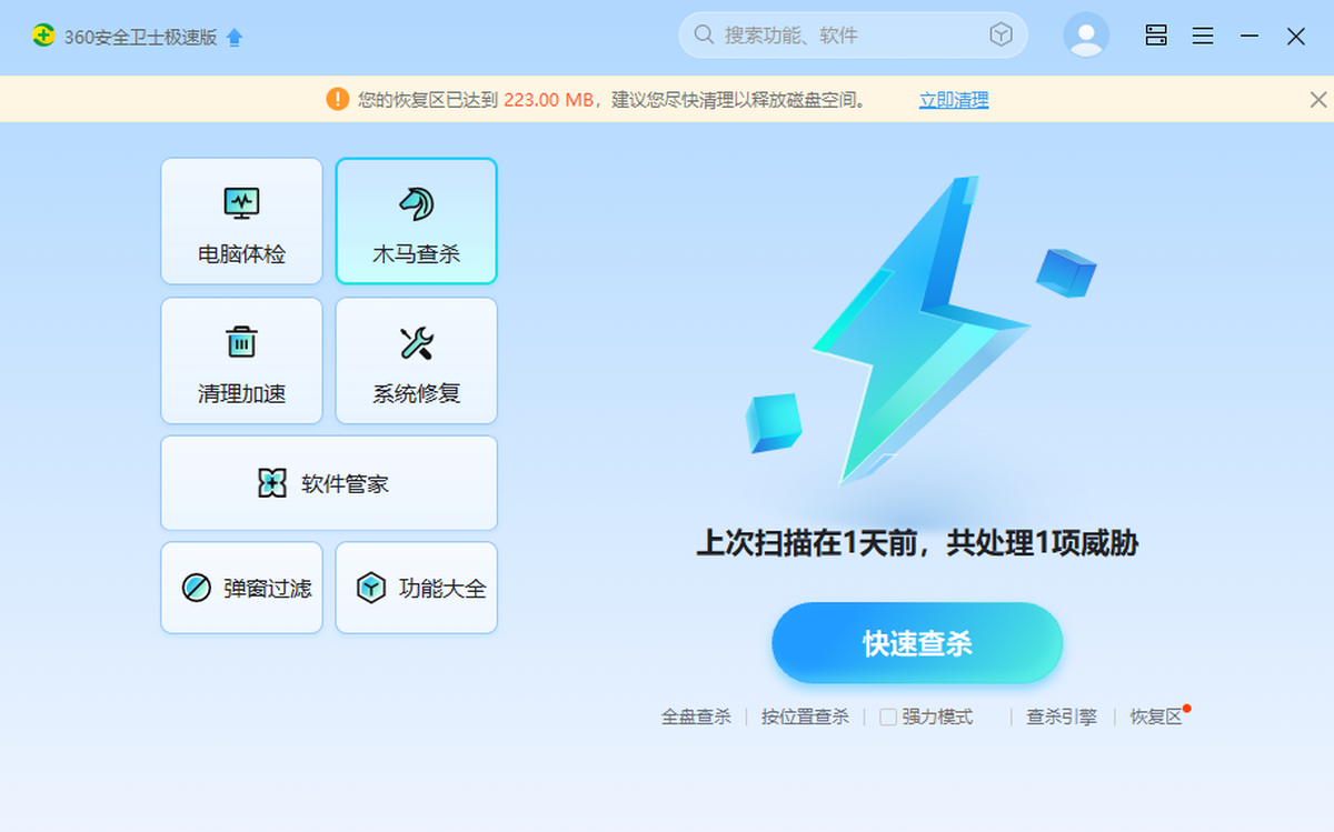 360安全卫士极速版在原有版本的安全防护功能基础上,新增了网络安全、数据安全、安全大脑实时检测,聚焦安全防护能力升级、用户体验升级,以“全面安全”为理念,全方位守护网民的用网安全。在性能上进行了大幅提升,还在设计上化繁为简,全新的“人工智能蓝”UI,在用户体验的升级方面,主打永久免费,无弹窗广告。