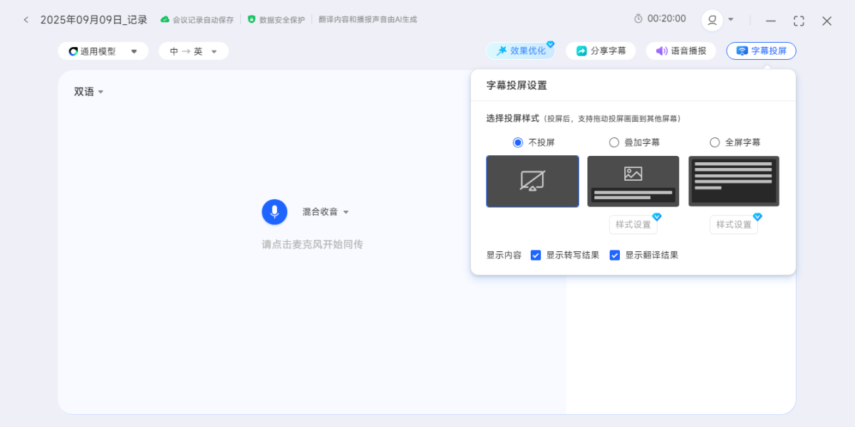 点击[快速同传],点击左上角麦克风按钮即开始会议录音;选择右上方[字幕投屏]按钮,可自由选择[叠加字幕]、[全屏字幕]、[不投屏]