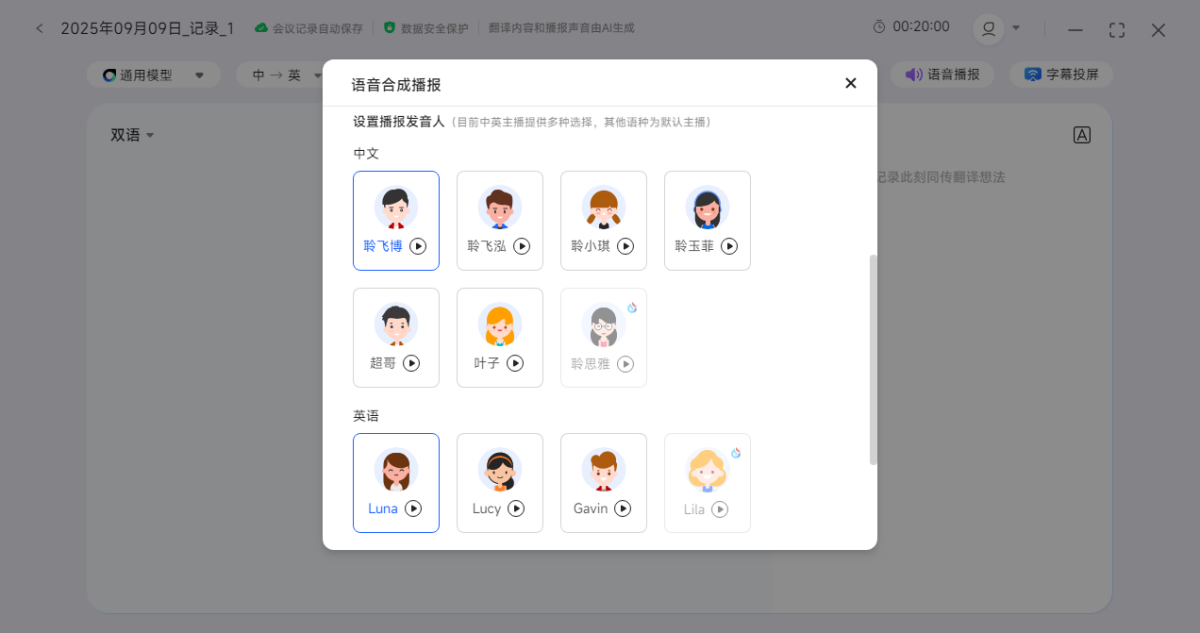 语音播报:可以一键分享会议原声及翻译语音播报,提供中文和英、日、韩、法、德、俄、西班牙、意大利语、阿拉伯语、泰语、越南语、粤语、维吾尔语、藏语语种的语音合成播放,解决会议现场和在线场景看字幕、听同传的诉求。