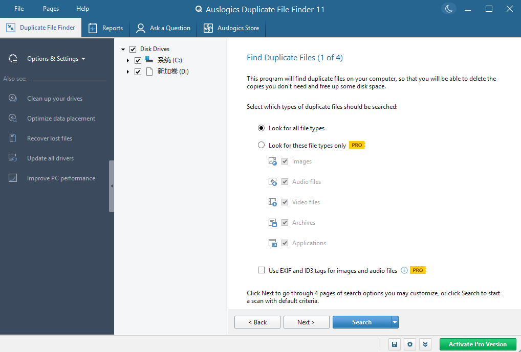 通过设置各种搜索条件来查找重复文件:寻找图片、音频、视频、存档、应用程序,或选择浏览所有文件类型。设置文件属性为忽略,跳过过大或过小的文件,输入文件名或命名部分,或者让程序用默认设置进行搜索。