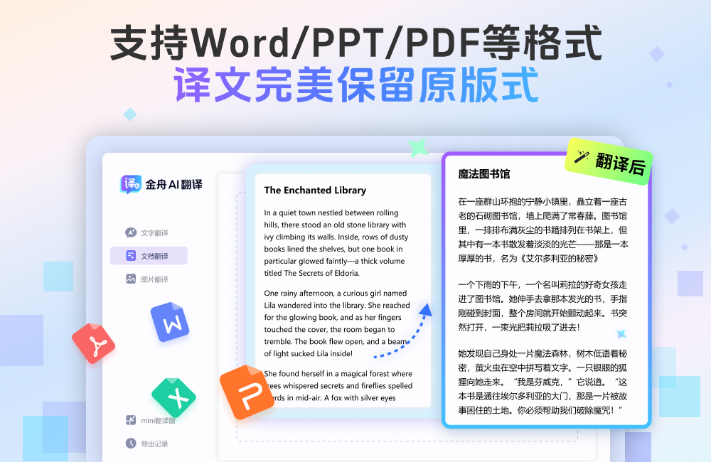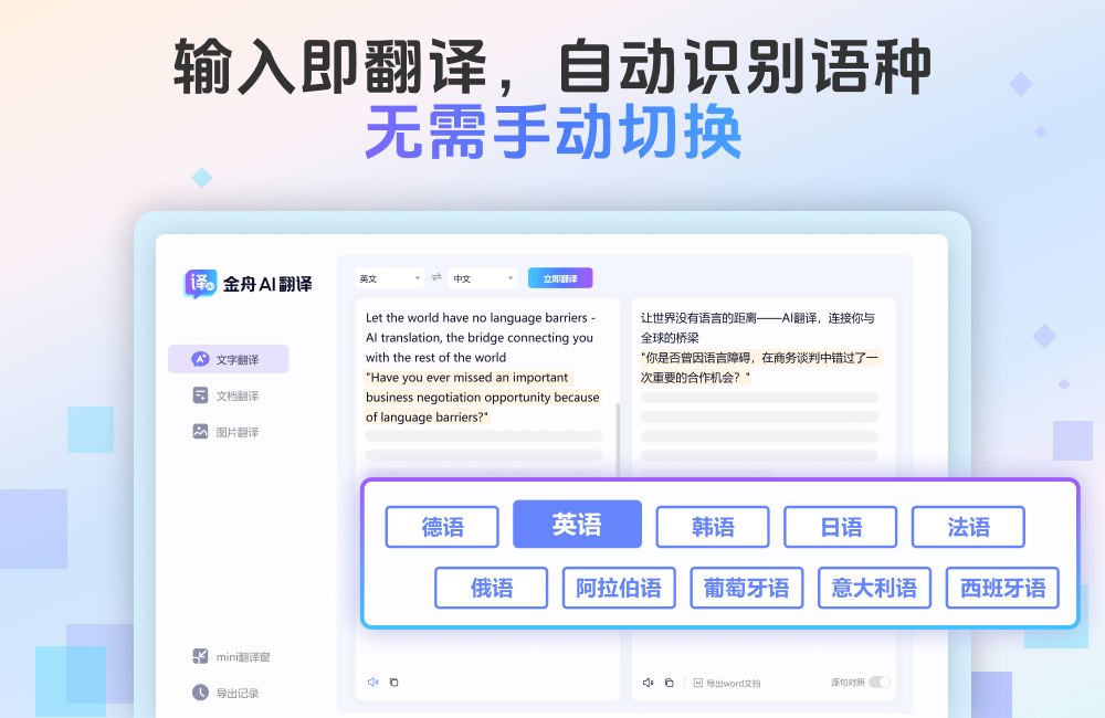 翻译,文字翻译,文本翻译,文档翻译,图片翻译,截图翻译,pdf翻译,word翻译,excel翻译,txt翻译,翻译器,英语翻译,中英文翻译,中韩翻译,日文翻译,俄文翻译;金舟AI翻译是一款精准高效的翻译软件,支持多国语言互译,部分功能支持本地化处理,支持文字、文档、图片、截图翻译,既保护您的隐私安全,又极大提升处理外文资料、跨境沟通的效率,助您事半功倍。