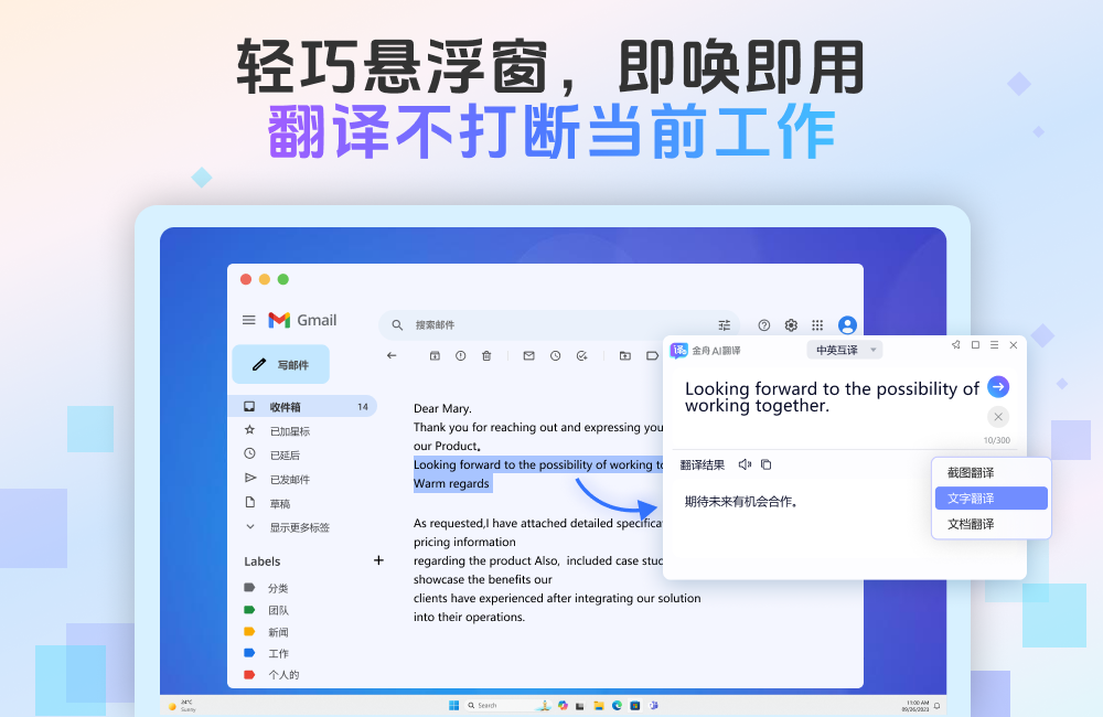 轻巧悬浮窗,随时呼出,快捷翻译,不影响当前工作,支持快捷键操作,提升工作效率。