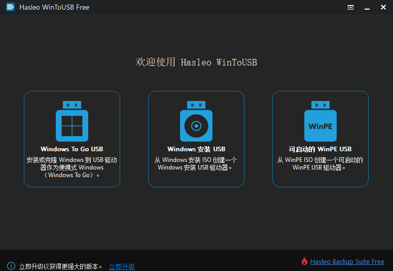 WinToUSB 是一个Windows To Go 创建器软件,可以将 Windows 操作系统从一个 ISO、WIM、ESD、SWM、DBI (DBI 是 Hasleo Backup Suite 生成的备份镜像文件) 文件或 CD/DVD 光驱安装到 USB 移动硬盘、U 盘和 Thunderbolt 驱动器,还可以帮助您将当前正在运行的 Windows 操作系统(Windows 7 及以后版本)克隆到 USB 移动硬盘、U 盘或 Thunderbolt 驱动器,因此可以在 USB 移动硬盘、U盘或 Thunderbolt 驱动器上运行 Windows 操作系统(微软称其为 Windows To Go,通常称之为 Windows Live USB 或便携式 Windows)。WinToUSB 的另一大功能是使用 Windows 7 及以后版本的 Windows 安装镜像创建 Windows 安装 USB 驱动器,因些您可以使用 USB 驱动器轻松地安装 Windows。最后 WinToUSB 支持创建基于 WinPE 的 USB 启动盘,它能够帮助您将 WinPE 启动镜像或启动光盘中的内容迁移到 USB 移动硬盘或者U盘并保证可以从 USB 启动。
