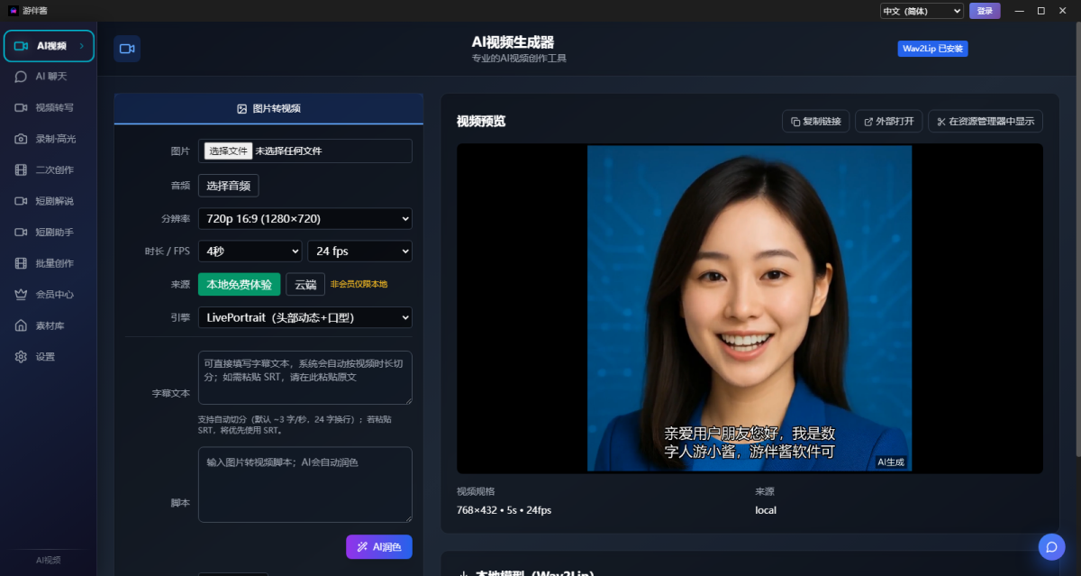 上传照片生成说话视频,口型精准同步,支持本地免费模式和云端高效模式